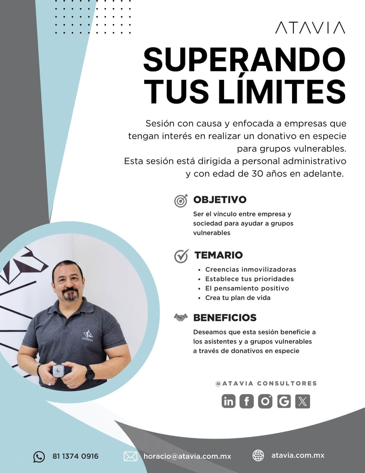 En Atavia, tenemos la vocación de ayudar siempre a los demás sin esperar nada a cambio, con nuestra iniciativa Superando tus Límites, ofrecemos una alternativa gratuita y altruista a las organizaciones dispuestas en apoyar a grupos vulnerables. Súmate a este esfuerzo y ayúdanos a ayudar.